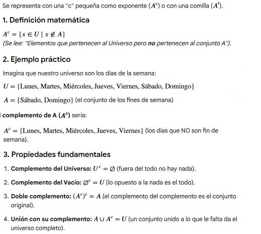 El complemento de un conjunto es todo aquello que está fuera de él, pero que pertenece al Conjunto Universal ( U ). Es decir, es lo que le falta al conjunto para ser igual al universo