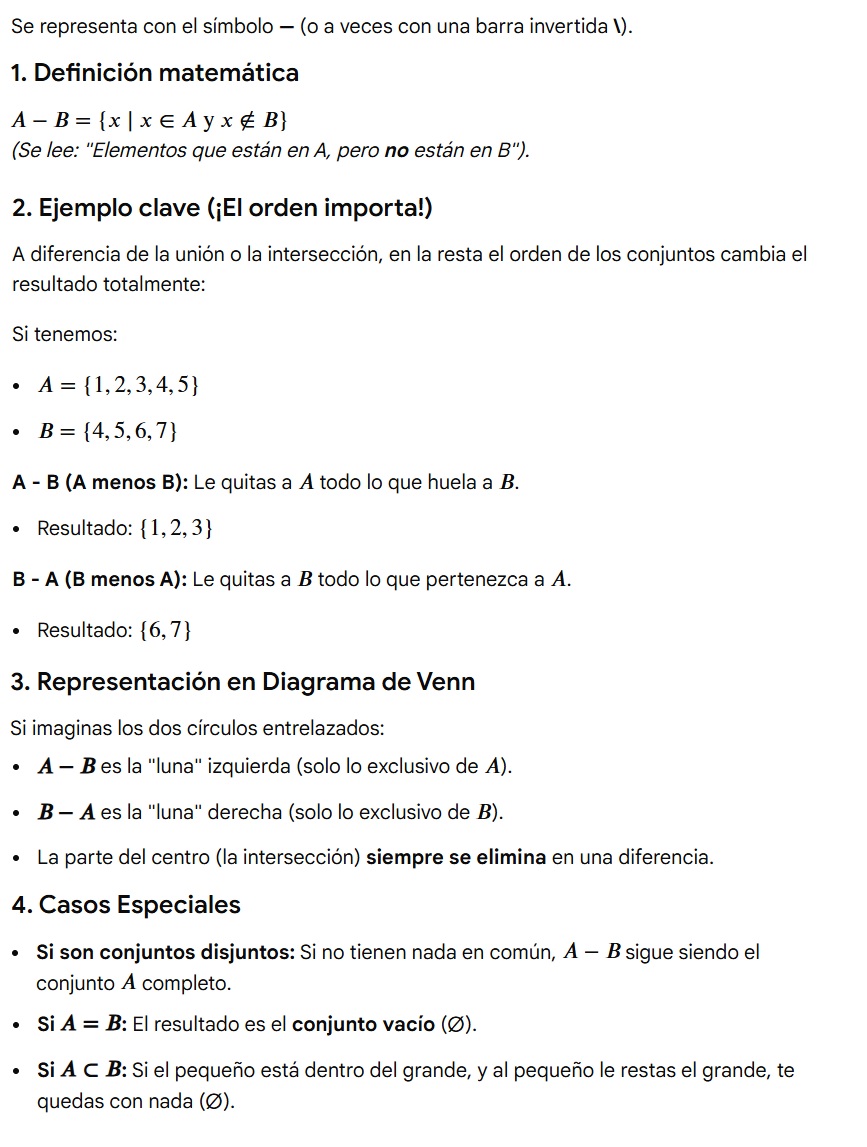 La diferencia de conjuntos es la operación que nos permite encontrar los elementos que pertenecen a un conjunto, pero que no están en el otro. Es como hacer una "resta" de elementos.