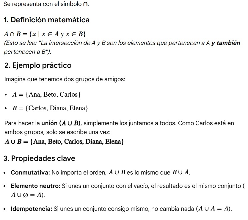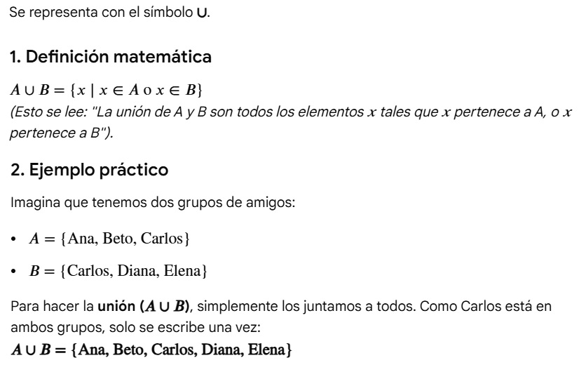La unión de conjuntos es la operación que consiste en reunir en un solo conjunto todos los elementos de dos o más conjuntos, sin repetir ninguno.
